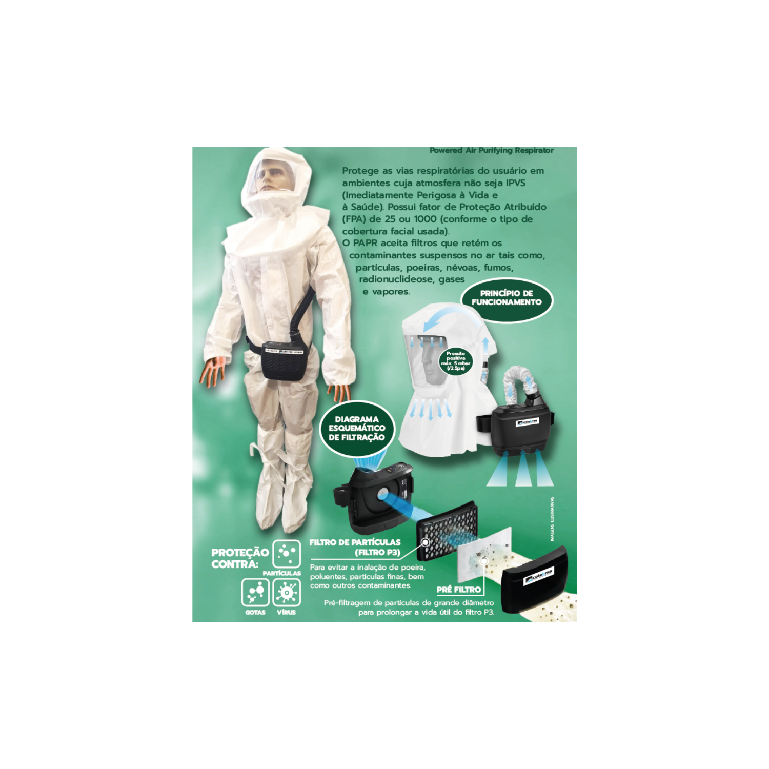 O PAPR utiliza filtro que retém contaminantes suspensos no ar, tais como partículas, poeiras, névoas, fumos, vapores e aerossóis.