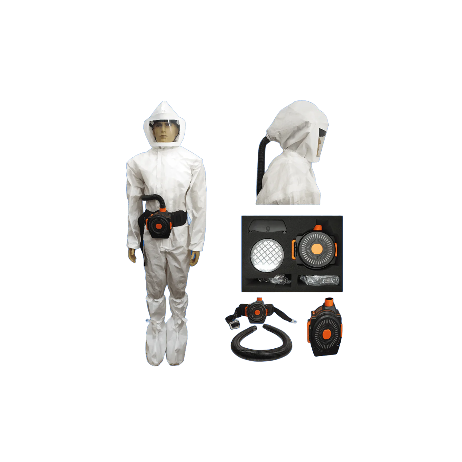 Respirador purificador de ar evolutivo sistema motorizado, constituído com capuz de proteção respiratória, conjunto motorizado composto de bateria , alarmes audíveis que avisam aos usuários quanto aos baixos níveis de bateria. O conjunto motorizado possui internamente um filtro mecânico de combinação tipo HEPA, com indicação visual e alarme audível, todo sistema motorizado é preso à cintura do usuário com contornos confeccionados em espuma para melhor conforto.